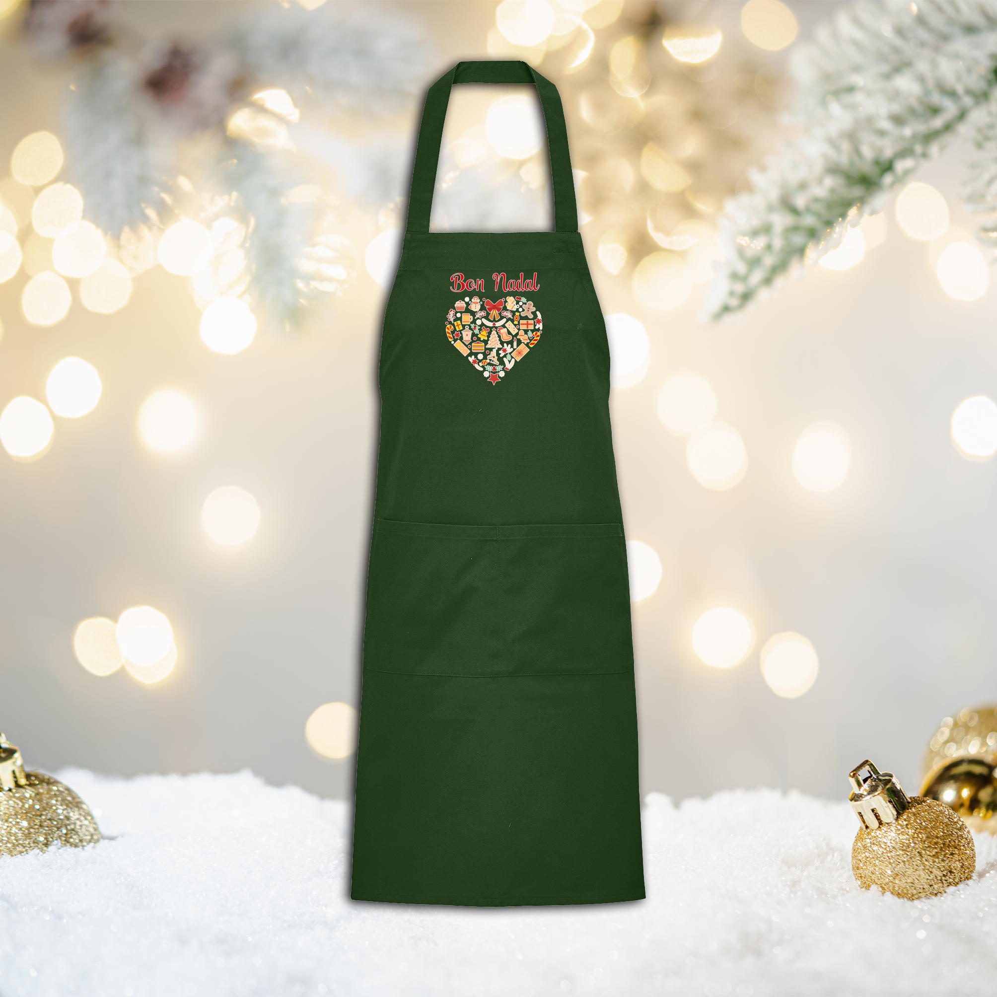 Le tablier Gamma tient la distance : twill 240 g, poche avant à deux compartiments et encolure réglable. Son fond vert bouteille sublime le motif “Cœur de Noël”. Idéal en pâtisserie, traiteur, boutique ou pour offrir. Impression locale, esprit catalan.